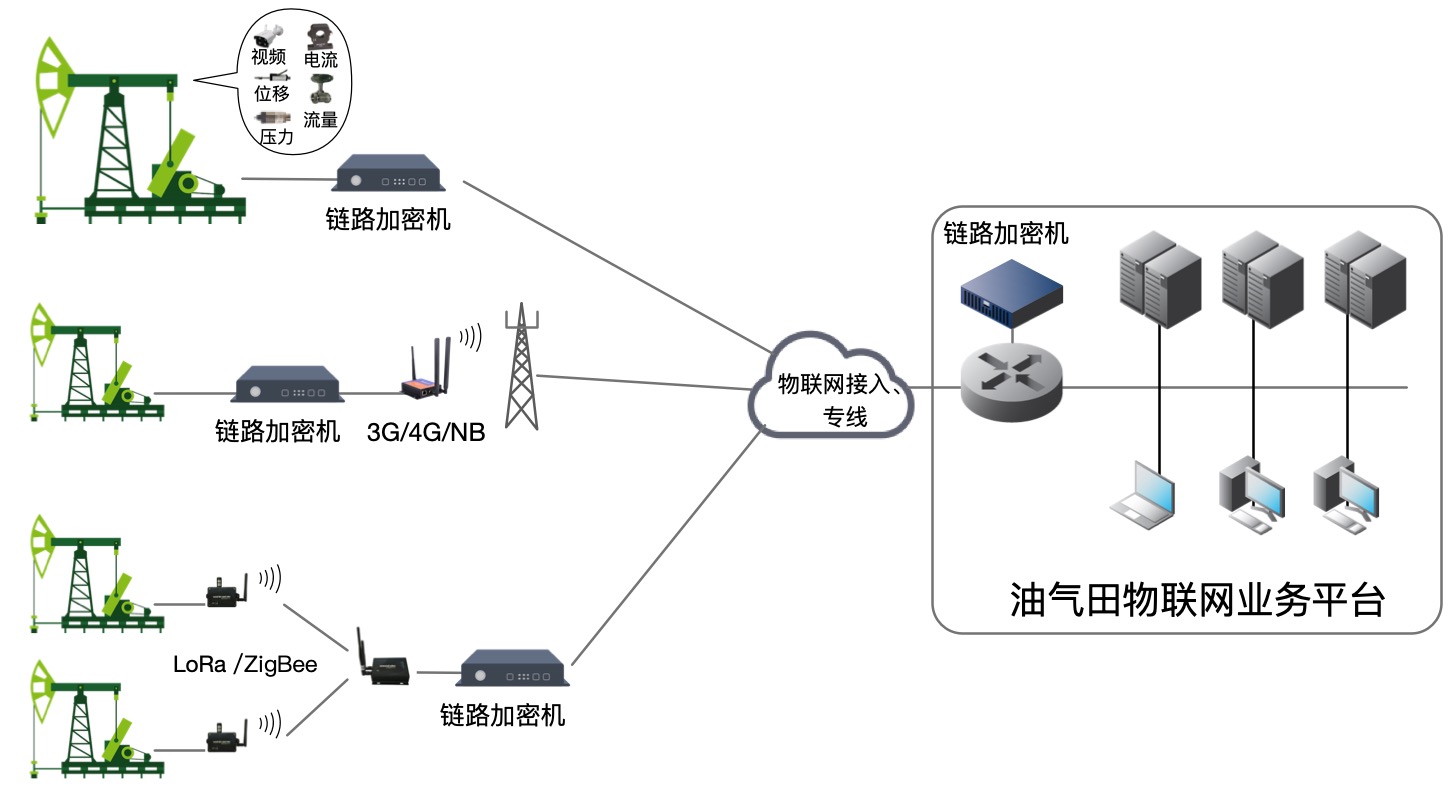 在油田、氣田信息采集/物聯網接入場景中,前端各類傳感器(電流、位移、流量、壓力)和視頻監控等上行數據,以及控制指令等下行數據,可能使用以太網、3G/4G、LoRa/ZigBee等多種傳輸協議和連接形式。